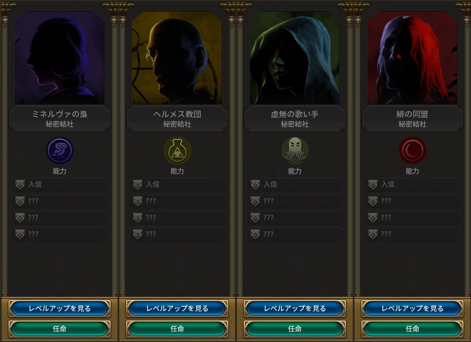 それぞれ条件を満たす事で招待状が届き、強烈な効果を持った結社に入信する事ができます。