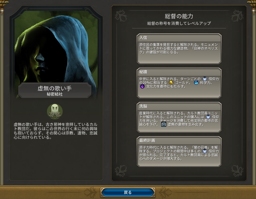 そのプレイスタイルと抜群に相性の良い結社であり、宗教軸プレイの欠点である中盤の科学/文化出力を完璧にフォローしてくれます。