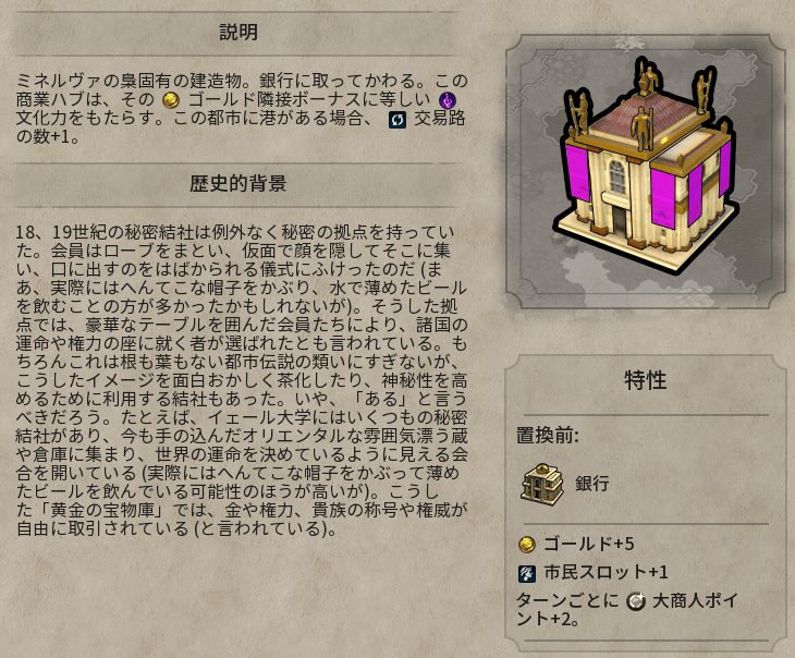 それをメインに文化勝利を狙う場合は聖骨箱を使ってみたくなるでしょうし、総じて宗教主体の文明で使うことがコンセプトになっている結社でしょう。