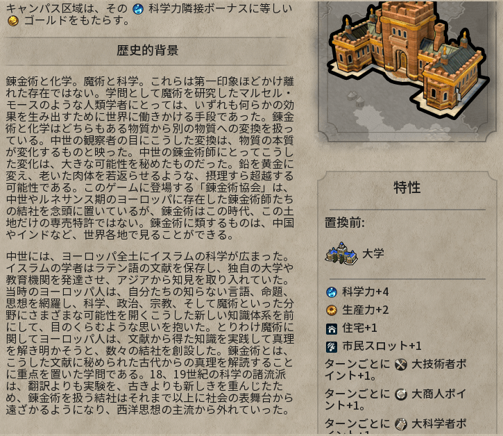 錬金術教会は工業系の偉人ptにボーナスが得られ、アラビアであればマドラサとの同居が可能です。