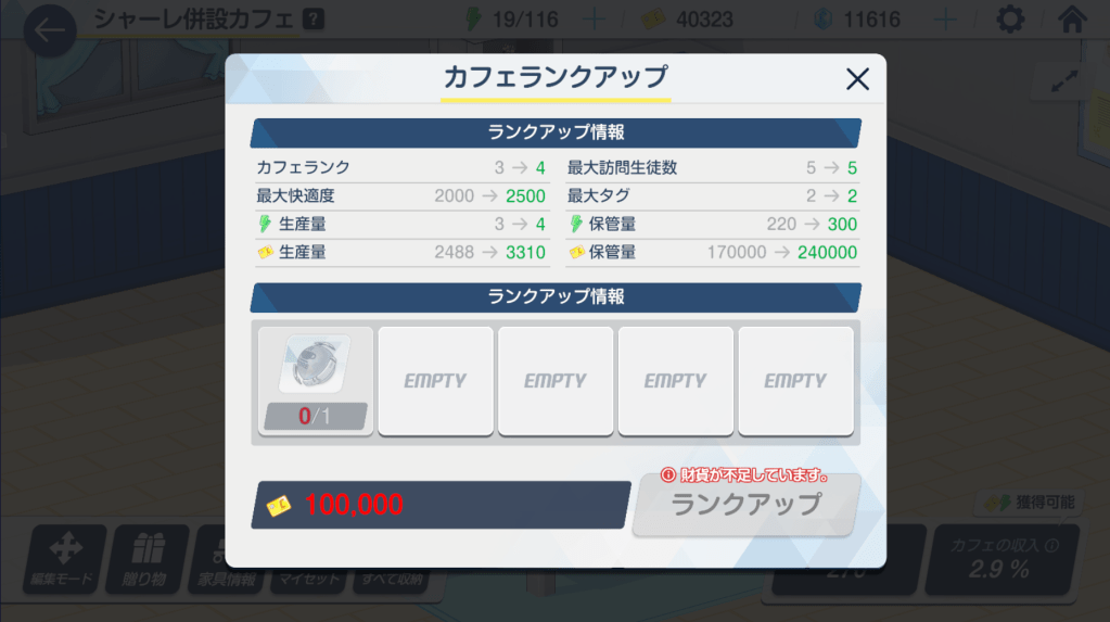 右下の快適性って所をタップするとカフェのランクアップができる。