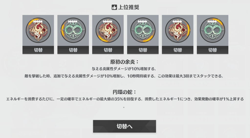 例えばこれはアシュラやカグツチのような炎+エネルギー用の推奨構成なのですが、原初の余炎は奇数、円環の蛇は偶数スロット時に攻撃系の刻印効果が付くようになっています。