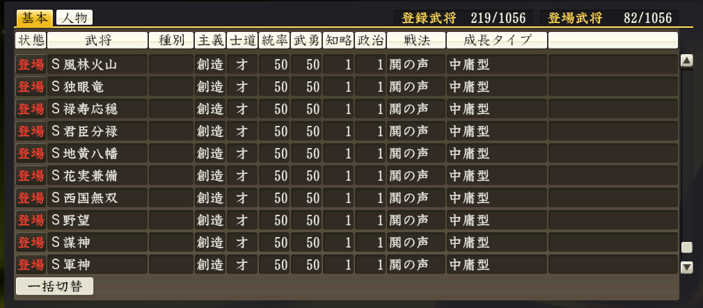 KOEIのゲームはある程度エディットするのを許容してくれる文化があるので、ゲームに慣れたら気持ちよく遊べるようにカスタマイズするのも良いと思います。