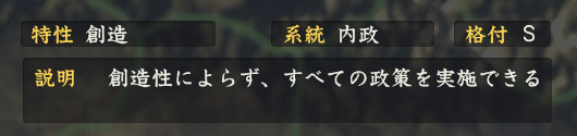 能力主義はパラメータに見どころのある武将の忠誠アップと成長加速の効果があります。