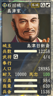 ちなみに本城は国人衆の取込によって強引に人口を増やしたりもできるのですが、支城はそういったブーストも使えないため中盤以降は農業or商業重視にして米や金をどんどん産出して貰うのが良いと思います。