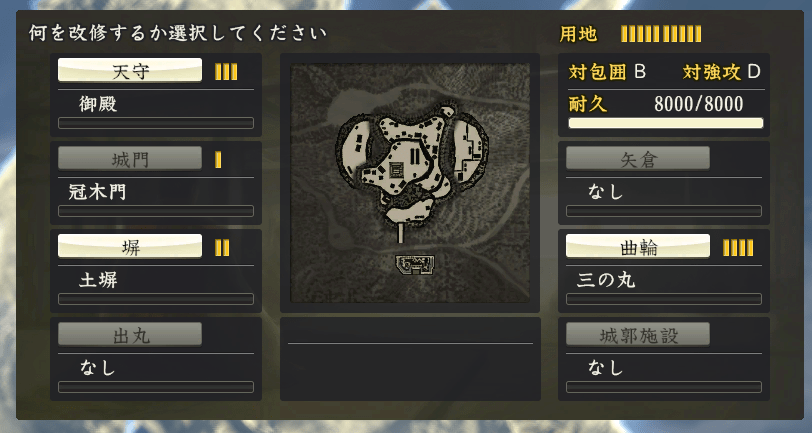 用地の多い城であれば城郭施設も作りたくなりますが、城に資源が必要な上に前提条件として城の各パラメータを平均的に上げる必要があます。