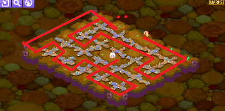 この辺も息抜きにやりたい方は画像のように一筆書きで全エリアを埋めて、ボス部屋前の2部屋を往復する形で狩るのが良いと思います。