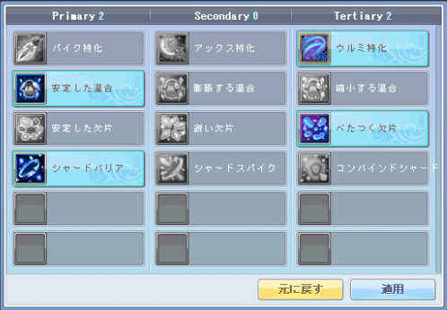 属性UPはイェフネン用で水UPにしていますが、自分のキャラに応じたものにしましょう。