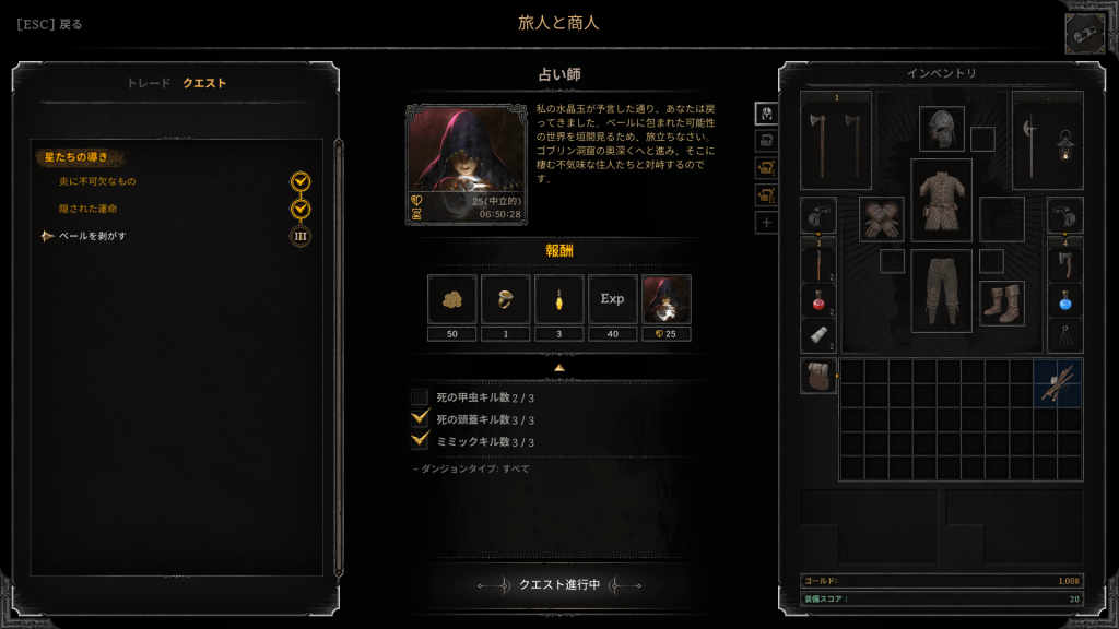 例えば包帯を持ってきてくれというクエストであれば、ダンジョンで見つけた包帯を持ち帰ってきて渡す必要があります。