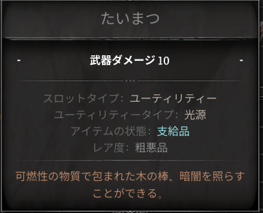ちなみにたいまつは移動速度ペナルティが他のアイテムや武器と違って無いようなので、最速移動したい時にもたいまつを咄嗟に持つのがいいと思います。