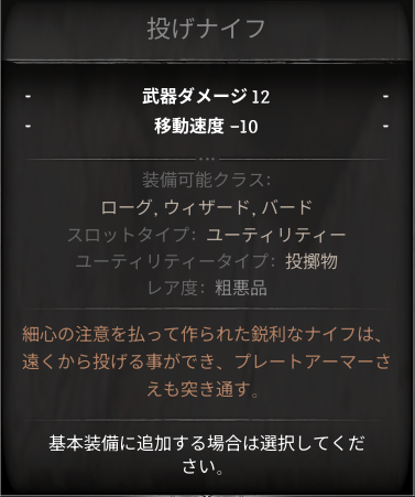 着弾時にデバフ付与するスキルとの組み合わせは地味に強いと思いますし、上記投げ物を装備できないクラスにとっても咄嗟の飛び道具として使えると思います。